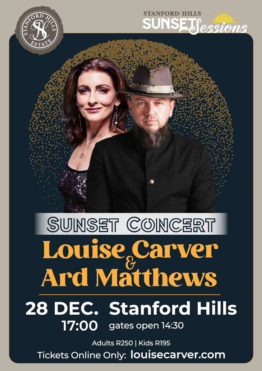 Catch Louise Carver & Ard Matthews 28 Dec 2023 at Stanford Hills Wine Estate – 28 Dec 2023 – Gates open from 15:00 – Show Starts at 18:00